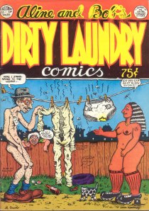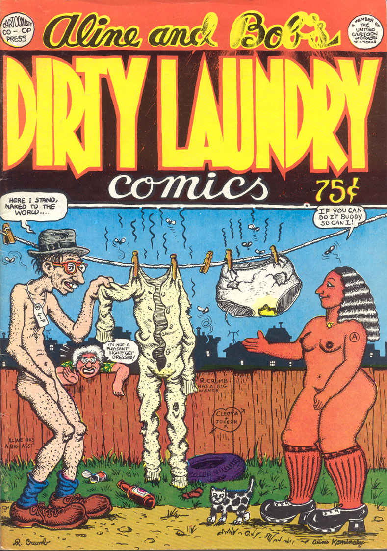 He married Aline Kominsky in 1978 and they’ve collaborated on several projects over the years, she being a cartoonist in her own right. Apparently, friends of Mr Crumb had noticed a resemblance, in both name and curvature, between Ms Kominsky and a drawing Crumb had done for Snatch Comics #1 depicting “Jail Bait of the Month, Honey Bunch Kaminski” around 1968 (you’re gonna have to google that one yourself) and thought to introduce them. One of their most notable collusive efforts has been a series of domestic tales, called Dirty Laundry, where they each draw themselves. (later along their daughter Sophie joined in) I’ve seen (and may even have — somewhere) several of those comics and it’s striking to see the obvious differences in drawing style within the same panel.
