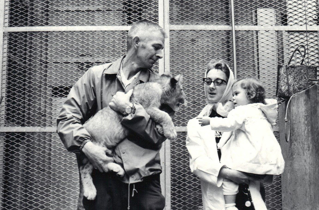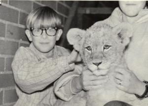 Me and a Lion cub sitting on the stairs at the newly built Children's area of the Woodland Park Zoo. Published in the WPZ newsletter "Zoonews" ca 1967