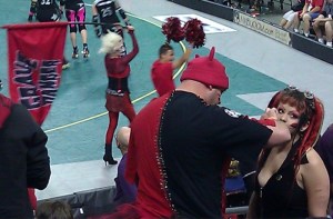 And the fans! We were sitting in the Grave Danger team’s section and a couple rows in front of us sat a huge, powerful looking guy in GD red and black wearing a tutu. Think about that for a moment. Yeah, that’s a Fan, big time, and the arena was full of em (over 4,000 folks). We weren’t sure we would ‘blend in’ to the crowd, our being 50ish hippie throwbacks, and me with long, white hair, but there was such a riot of style and color and age that there was no way you couldn’t fit in!